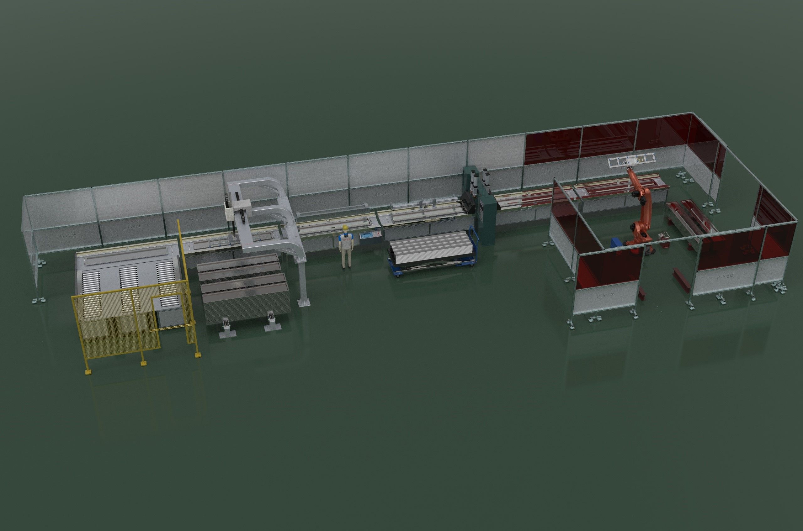 5、焊機及成品下料區(qū): 通過設(shè)備進行自動焊接,焊接高度小于門板鐵皮高度,當焊接完成后,機器人工位自動翻轉(zhuǎn),使用吸盤進行自動取下,按預(yù)定軌跡進行堆放,當一個成品料堆,堆放達到指定要求時,系統(tǒng)給予提示,并自動選擇另一個堆放平臺進行下料,保證下料料堆更換線體不停機。機器人選用庫卡 KR210R2700EXTRA。